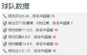 场均数据很惨——几乎全部垫底,只有红黄牌是第一