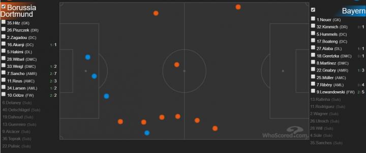 (图)双方上半场主动失误统计,拜仁全在对方半场,多特却集中于守转攻,这就是经验的差距
