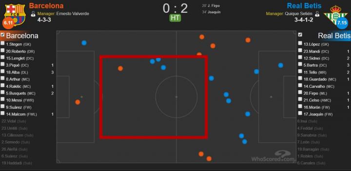 不仅如此,巴萨的中场也没能把控球率牢牢抓在自己手里。上半场他们“只”拿到了55%的控球率,在贝蒂斯越打越兴奋的同时,他们却始终还是在站着踢球,导致失去支援的梅西等人也渐渐偃旗息鼓。在这个半场,巴萨全队的跑动距离比对手少了接近2000米,这真是一个让人无语的数字。