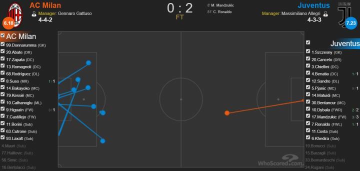 看看边后卫,你就能找出答案。桑德罗和坎塞洛虽然风格不同,传中准星也忽高忽低,但双双都能单凭个人能力就直接发起进攻威胁。前者送出3次关键传球、后者1次关键传球外加2次射门,而这正是米兰最欠缺的“蛮干”能力。不仅是边卫,曼朱能压制领空,迪巴拉能任意球中柱,C罗更是能把任何可能的机会都变成威胁射门。这些,都是肉眼可及的差距。