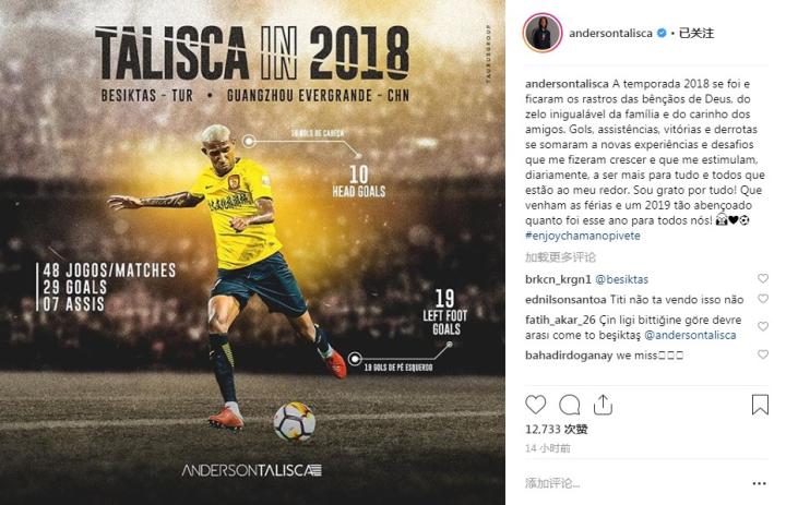 塔利斯卡在Instagram上写道:2018赛季已经结束,感谢上帝保佑、家庭支持和朋友的祝福。进球、助攻、胜利和失败都让我增加了新的经验和挑战,这些经验和挑战让我获得成长,激励我为周围的一切奉献更多。我很感激这一切,现在我要休假了,希望2019年,我能为所有人带来幸福。