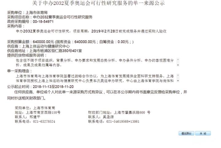 据《公示》里的单一采购理由,上海市体育局与上海体育学院签署过战略合作协议,为上海体育发展提供全面科研支持服务。上海体育学院授权上海上体运动与健康研究中心负责本次奥运申办研究。
