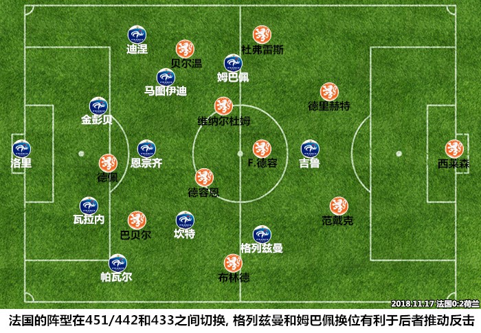 法国队此役的阵型架构为433/451,迪涅和恩宗齐分别顶替受伤的卢卡斯-埃尔南德斯和博格巴;荷兰队的阵型为433,罗纳德-科曼基本保留了上一轮击败德国队时的首发阵容。开场之后,主场作战的荷兰队迅速取得了比赛的控制权,法国人几乎从第一次掌控球权时开始就感受到了橙色风暴的压迫感。面对主队的进攻,德尚没有选择在前场展开逼抢,固守中低位防区本就是世界冠军的成功之道,吉鲁的存在会影响高位防守的质量,姆巴佩更加擅长利用冲刺空间。除了考虑到了己方球员的特点,法国队选择退守后场也是基于对荷兰队控球能力的忌惮。