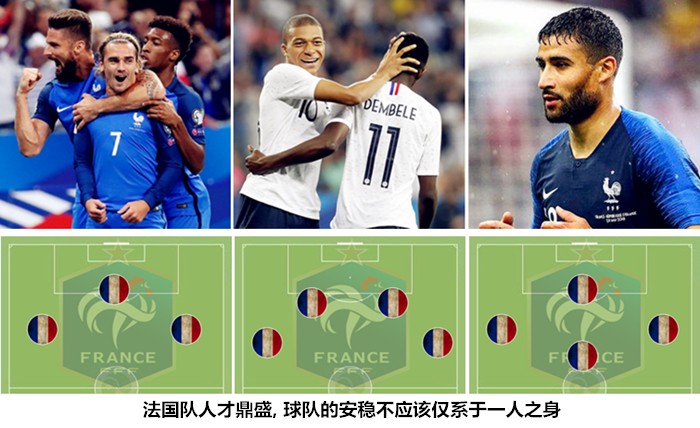 德尚在世界杯期间使用过无锋阵和中锋阵两套打法,相比由中锋吉鲁作为支点的442/4411体系,德尚最初更加青睐于由格列兹曼、姆巴佩和奥斯曼-登贝莱为三叉戟的433阵型。从实战效果上来看,这种基于自由换位的战术体系对铁桶阵的压制效果并不明显,过于靠前的站位浪费了三名灵巧性球员的推进和突击能力。从对阵澳大利亚的下半场开始,以吉鲁为支点的进攻体系便被沿用至今,蓝军中锋被作为阵地战的轴心和反击传送轴使用,奥斯曼-登贝莱、格列兹曼和姆巴佩的进攻组合已经被搁置了很长时间。此役,在替补出场之后,奥斯曼-登贝莱先是在前场边路接球失误,后又在己方禁区前沿带球闯入人丛后丢球,穆萨-西索科的失误同样很多,他们都不是能够在逆境中凭借个人能力改变局面的球员。