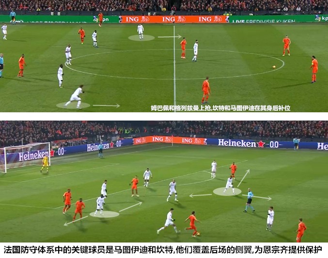 法国队沿用了自世界杯以来的4-5-1防守站位,德尚根据实际需要对部分球员的站位做出了调整。博格巴和卢卡斯-埃尔南德斯缺阵对法国防守质量的削弱是显而易见的,顶替他们出场的恩宗齐和迪涅均不以单兵防守能力强著称。坎特和马图伊迪必须在保证边路覆盖的同时兼顾中卫身前,前者需要适时填补帕瓦尔上抢后留下的空间来遏制荷兰左路的渗透,后者则变身左后卫直接面对对手的边路突击手。“史蒂文一直在和他的外表作斗争”,老相识蒙奇对恩宗齐的评语解释了他为何会在德尚的体系内表现挣扎,这位与布斯克茨球路相似的球员不是合格的低位防守执行者,围绕其建立的防反体系很容易在重压下瘫痪。