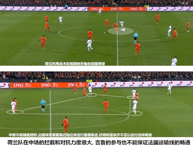 除了降低后场点对点的防守质量,博格巴缺阵对进攻推进的影响更为致命。由于马图伊迪和迪涅被压制在了后场,姆巴佩在进攻中很难得到了来自队友的支援,德尚将姆巴佩调整到左路为了便于其在反击中内切射门,而不是像世界杯时那样在外线承担一些进攻支援任务,来到右路的格列兹曼需要在球权转换时完成一定的衔接任务。德里赫特和邓弗里斯对姆巴佩的防守比较成功,德尚希望利用巴黎天才个人能力打反击的几乎落空了。坎特和恩宗齐不能很好地完成推进任务,吉鲁不得不频繁回到中圈弧为队友铺路搭桥,荷兰队的策略是利用战术犯规来限制吉鲁的用球,破坏法国的节奏。