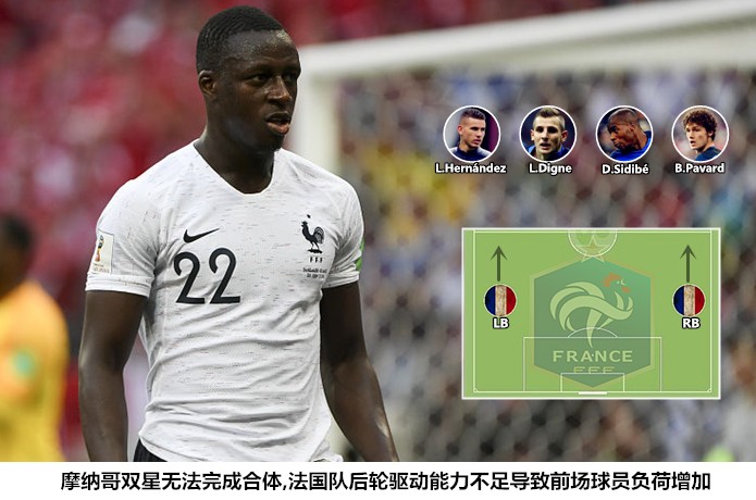 受限于中场技术含量不足和边后卫助攻能力有限,这支身价超过10亿欧元的冠军之师并不适合压上围攻对手。俱乐部时期的多面手卢卡斯-埃尔南德斯和帕瓦尔只能作为边路进攻体系里终结者,马图伊迪和格列兹曼只是将前场边路作为驿站,进攻宽度不足严重影响了法国队的阵地进攻能力,德尚不得不在强强对话中选择防反战术。