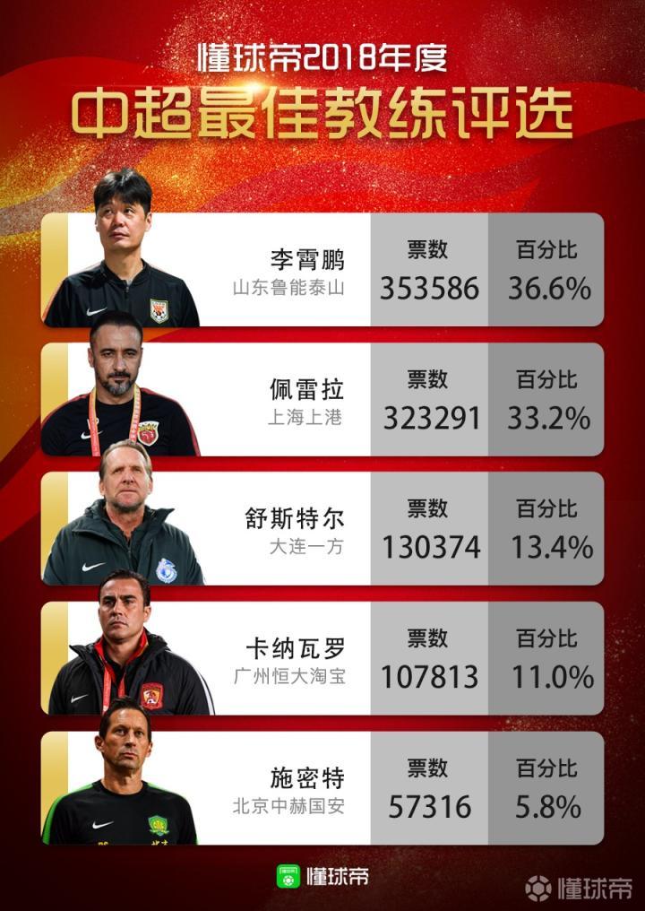 懂球帝2018年度中超最佳教练得主正式揭晓!本赛季带领山东鲁能泰山获得联赛季军的李霄鹏获得36.6%的投票,力压其他四位候选人当选懂球帝2018年度中超最佳教练!