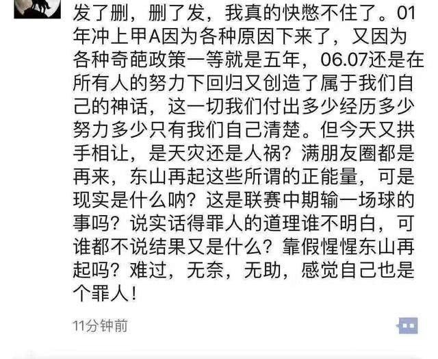 很可惜的是,下个赛季的中超联赛,除了那个才华横溢的杜震宇,我们也无法见到长春亚泰这支昔日的冠军球队,就像杜震宇发的那条朋友圈,人人都会说正能量,人人都在说什么东山再起,其实这种无奈、痛苦、遗憾只有球员们最能体会,即便是杜震宇这样什么都经历过的老将,也无法理解球队这样的表现。降级所带来的打击甚至要远远超过夺冠获得的喜悦,因为夺冠证明你比所有人活的都好,但降级却宣告了你在顶级联赛的死亡。看看这些年降级的球队,青岛中能、石家庄永昌、杭州绿城、辽宁宏运、延边富德、上海申鑫……,其中唯有北京人和、河南建业等少数球队能在不久之后重回顶级联赛,其他球队只能在中甲联赛中苦苦挣扎,像曾经的足球城球队青岛中能,如今更是跌入到乙级联赛度日,可见一入中甲深似海,想要再升级绝没有那么容易。