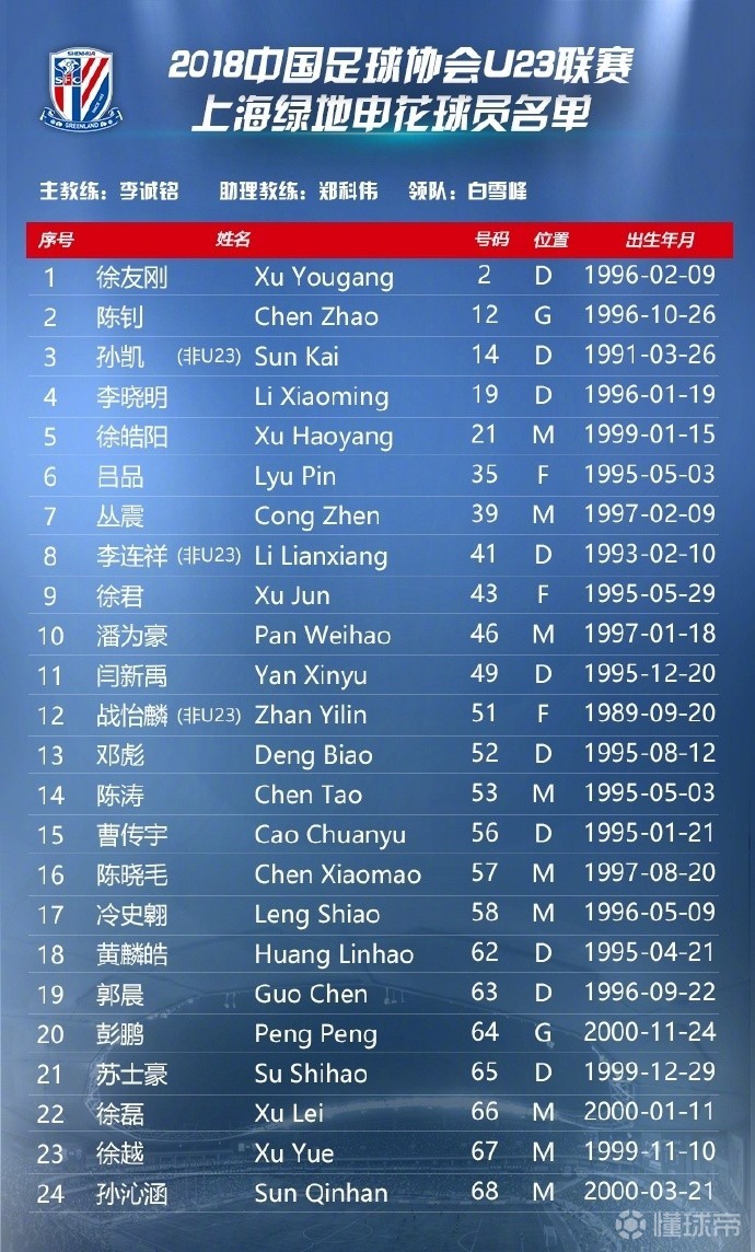 今天,参加足协U23联赛的申花全队在主教练李诚铭的带领下在康桥基地集结。本届U23联赛将在11月27日正式打响,申花公布了参赛名单。孙凯、李连祥和战怡麟三人作为非U23球员入选,名单如下: