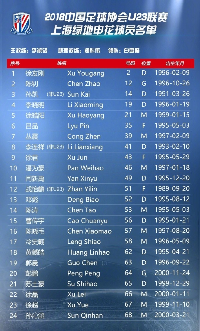 申花U23联赛名单:徐友刚、徐皓阳、丛震领衔