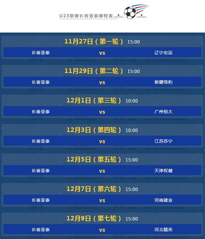 U23联赛下周二打响,长春亚泰明日兵发盐城