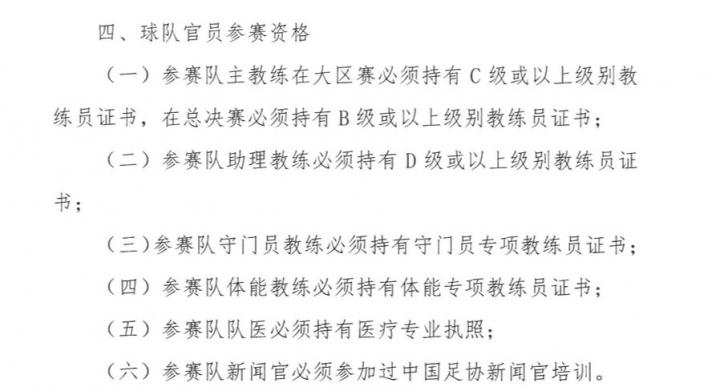 而对于主教练、助理教练、守门员教练、体能教练、队医、新闻官等球队官员的资质提出了明确的要求。其中,参赛队主教练在大区赛应具备C级或以上教练员证书,在总决赛必须持有B级或以上级别证书,不符合资质的只能以代理主教练身份参加相关活动。
