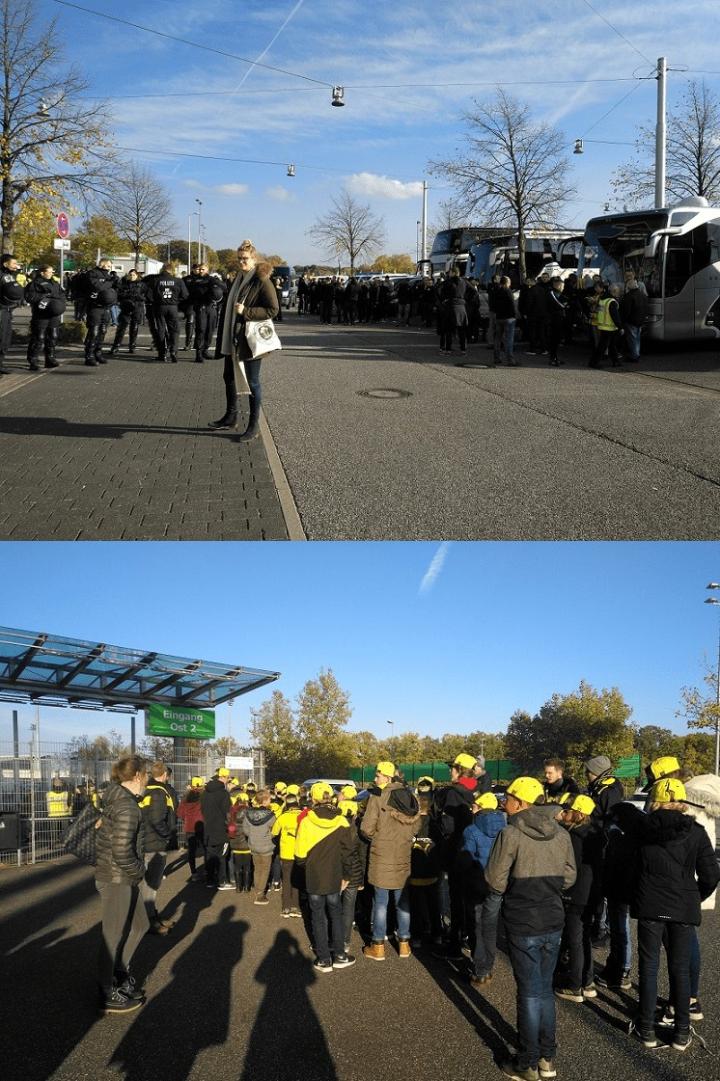 比赛日似乎是当地人的节日,来看球好像是一大休闲娱乐方式。沃尔夫斯堡主场对阵多特蒙德和门兴格拉德巴赫主场对阵杜塞尔多夫的当天,体育场都大约提前2个小时对普通观众开放,主队的球迷不说,连客队的球迷都一批批乘坐大巴赶赴球场,开赛前球场外很快就人头攒动,当地政府也作为惯例派出骑警、警察和警车维护秩序和安全。还有多特蒙德小学生团,从150英里外的多特蒙德来到沃尔夫斯堡看球。