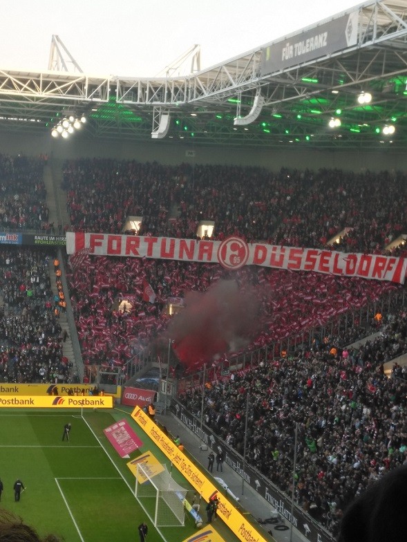 和很多德甲球场的布置一样,客队杜塞的球迷主体占据观众席一角,和主队球迷主体遥遥相望。他们在比赛中多次在看台上制造烟雾来为杜塞助威,由于弄出的声响实在太大,裁判也不得不好几次让杜塞队长去和球迷交流,让他们安静一点儿。这种激情的助威方式似乎在德甲很常见。足够激情,却还没有转成暴力。
