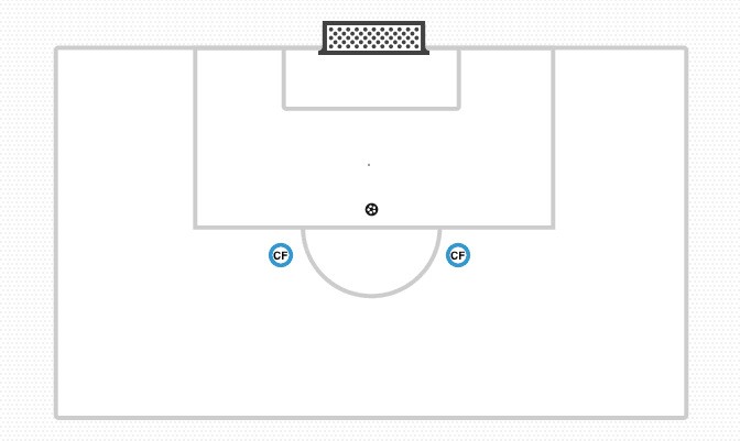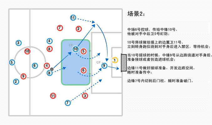 这一跑位会打破对手防线的平衡,使得蓝方可以打入到对手防线后,并从边路区域传球,最终完成射门,而中锋(蓝色9号)则迂回到禁区随时准备破门。