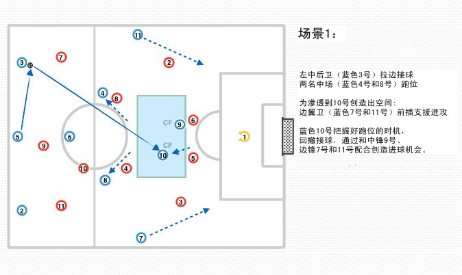 两名中场(蓝色4号和8号)跑位为渗透到10号创造出空间;