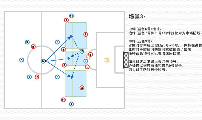 中锋(蓝色9号)占据对方中后卫(红色5号和6号),保持在高位。此时对手防线间的空间就被创造了出来,使得蓝色10号可以在防线间接球。