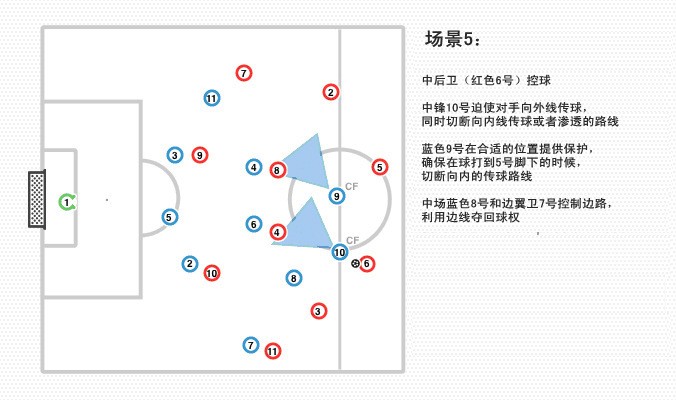 这个压迫也是蓝色4号快速出击夺回球权的暗示,或者迫使对手匆忙将球传给11号,他早已被我方边锋7号控制。