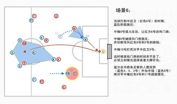 蓝方在中路有足够的人数优势(蓝色3、5、2号)外加中场(蓝色6号)将对手中锋红色9号和11号团团围住。