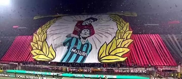 “Tifo”这个词来源于拉丁语系,其意义的起源来自于古罗马时代观众观看角斗士决斗时挥舞的旗帜。而目前,这个词代表的是像上图那样,由球迷在看台上组成的大规模巨型画面。而现代意义上的TIFO的发展则全靠AC米兰和国际米兰球迷之间不断升级的对抗。