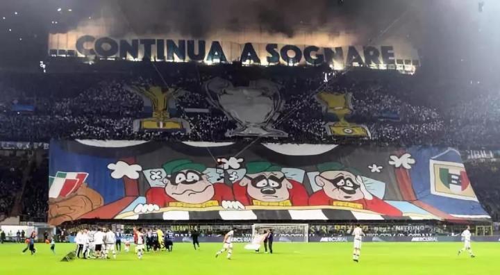 来简单的解释一下这个TIFO的意思,国米球迷那次悬挂出的巨大横幅,图案中最下方是小偷模样的三人躺在床上,盖着黑白色的被子(象征尤文图斯),两侧则分别是意乙标志和象征着偷来的意甲冠军标志,三个小人的上面则是国米赢得的三座冠军奖杯,最上方则是一句口号,“你们继续做梦吧。”但是,尤文最终还是获得了冠军。