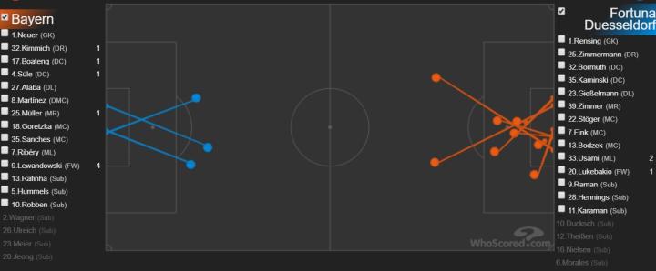拜仁牢牢占据着场上的主动,几乎就没给对手半点挣扎的机会。虽然全员退守的杜塞尔多夫利用宽度覆盖很好地限制了拜仁的边路进攻,但他们的反击最多推进到中场就逃不开被拦截的命运,诺伊尔不跑到中圈就没什么上镜的机会。