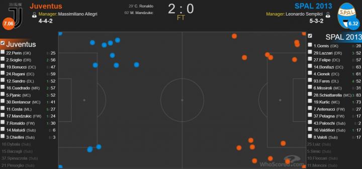 442所带来的变化,首先体现在了控球上。由于中场少了一个人,因此尤文本场比赛没有花太多心思来利用传球控制节奏,基本上都是很快就把球转移到边路来直接发起进攻。前半小时,主场作战的斑马军团控球率居然只有40%左右。要知道他们面对的不是那不勒斯,而是斯帕尔……