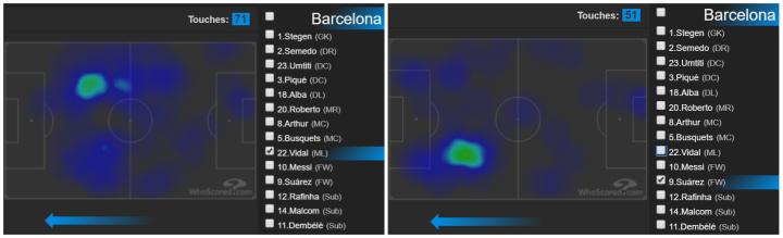 虽然牺牲了边路进攻的宽度,但好在比达尔前插的欲望非常强烈。梅西回撤时,他的跑动几乎能和苏亚雷斯齐头并进。这种类似上赛季保利尼奥的踢法,确实是现阶段巴萨很需要的东西。