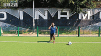完成快速抬腿之后我们开始射门训练,远距离射门需要很强的身体力量,今天的射门训练我们重点要保证动作的标准性,目标就是球门角,我们也可以放一瓶水作为目标。