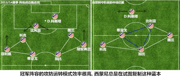 "马竞一直没有变,历来都是这样。我更喜欢马竞这种踢球方式,而不是像塞蒂恩的球队那样踢球。如果马竞按照巴萨那么踢,是没有机会竞争冠军的。我不认为马竞可以踢传控足球,这支球队就是为了以目前这种风格踢球而建立的。"老队长加比对马竞足球风格的解析可谓一针见血,2013/14赛季的成功让西蒙尼对442体系深信不疑,以戈丁和科克为代表的骨干球员一直保持着良好的状态,围绕他们进行战术建设足以保证马竞占据“西超”之下和西甲之上的亚空间。在接下来的几个赛季中,西蒙尼所尝试的所有战术改造都是基于“萨基链条”,他曾在不得以的情况下借助433、451和三中卫阵型应急,但这些阵型的出镜率实在太低,以致于连备选方案的标准都达不到。
