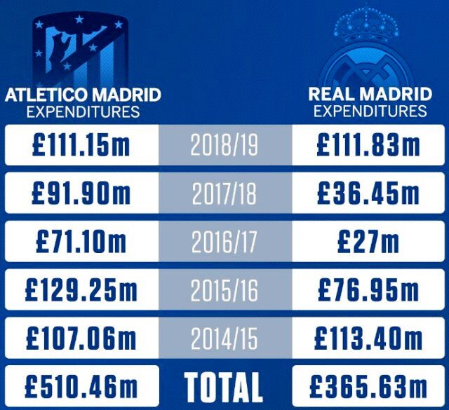 (图)近几个赛季,马德里竞技的引援力度超过了皇马,但大额投入并没有换来相应的成绩提升