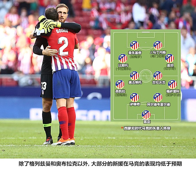 戈丁、科克和萨乌尔尚未摆脱世界杯后遗症的困扰,边卫二老胡安弗兰和菲利佩已经跟不上球队的节奏,由格列兹曼&迭戈-科斯塔组成的锋线缺少化学反应,后者更是在刚刚破荒后就遭遇伤病侵袭,同这些疲惫不堪、表现挣扎的主力球员相比,以卡利尼奇和热尔松-马丁斯为首的新援却在为出场时间太少发愁,西蒙尼在资源整合和人员调动方面显然是出了问题。