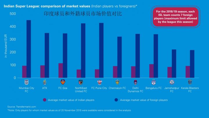联赛和俱乐部所面临的挑战依然是提高印度本土球员的水平。由下图所示,本土球员的市场价值依然明显地低于外籍球员,这一因素让印超联赛提高吸引力的长期能力充满了不确定性。