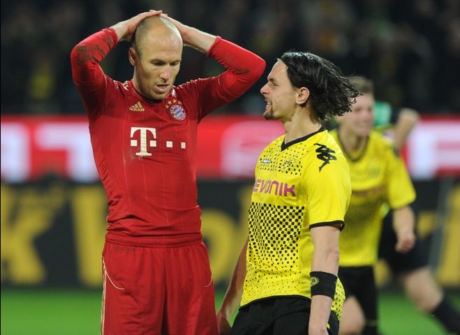 这个赛季,德甲联赛第30轮焦点战:领头羊多特蒙德坐镇威斯特法伦球场迎接拜仁慕尼黑的挑战。第77分钟,莱万多夫斯基脚后跟破门打入全场唯一入球,多特蒙德1-0拿下比赛、赛季双杀拜仁,黄黑军将领先优势扩大到6分。此战之前,多特蒙德在德甲积分榜上只领先拜仁3分,这场比赛被外界视为决定本赛季联赛冠军归属的天王山之战。罗本是这个夜晚最落寞的人,他在比赛中罚失了一记点球,对方中后卫苏博蒂奇则咆哮着跑到罗本面前挑衅。