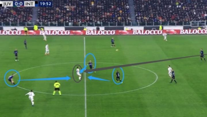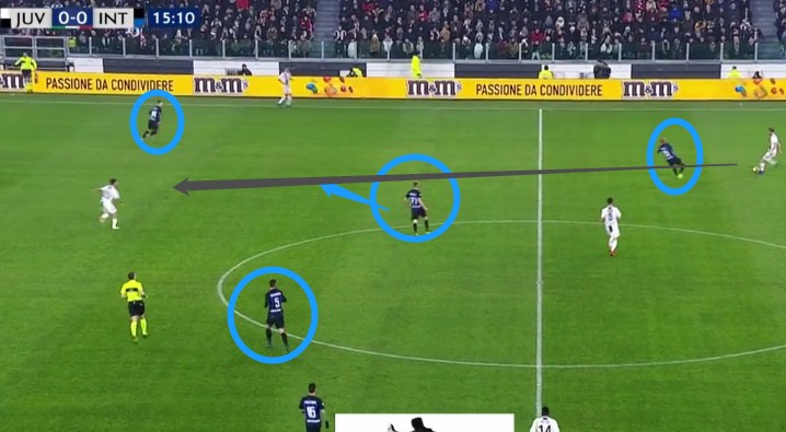迪巴拉在上半时受困于这种集中人员遏制中路的防线,送出了多次横向转移失误,而国米恰恰利用这种横向转移的失误,采用更加简单高效的方式策动反击,利用尤文边卫助攻上前后留下的防守空档。