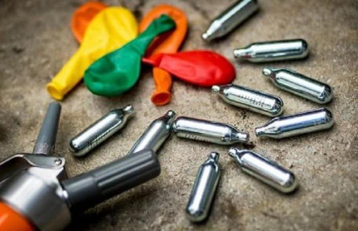 (图)盛放液态笑气的银色小瓶和吸食用的气球