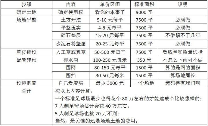 看完这个表,大家应该就知道建个足球场要花多少钱了。无论您看完了是打退堂了还是觉得这都是小钱,都衷心希望在祖国的大地上不断有新的足球场出现,以解决场地严重不足影响中国足球发展这一大难题。