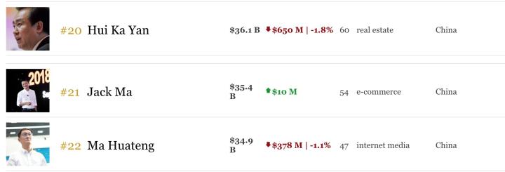 在全球总榜上,许家印的财富值排在第20位,马云(354亿美元)、马化腾(349亿美元)分列第21位和第22位。