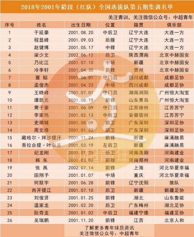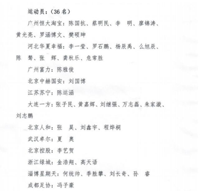 大连一方和北京中赫国安各3人,成都足协、广州恒大淘宝、江苏苏宁、深圳足协、河北华夏幸福、河南建业和麻涌融易各有2人入选。