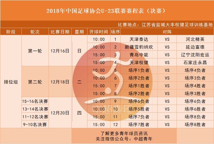 而在12月16日,U23联赛9-16名排位赛将在江苏盐城大丰的权健训练基地举行。具体对阵如下: