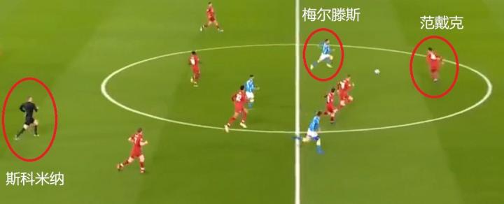 如上图可见,在这次那不勒斯的反击中,范戴克确实是最后一名防守球员,但由于这个球刚过半场,且球权并不在梅尔滕斯的控制之下,也就是说这是一次五五开的争抢机会,且范戴克的身旁还有两名回追防守的队友,所以这并不算一次阻碍明显进球机会的“战术犯规”,因而裁判不会根据这一条例给出红牌。