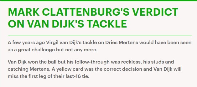 而有意思的是,《每日邮报》转述了昔日英超名哨克拉滕伯格对这一事件的判定是,“在几年前范戴克这次抢断甚至会被视为一次出色的争抢,但如今已不再是了,范戴克赢得了球权,但他之后的动作却是鲁莽的,他的鞋钉碰到了梅尔滕斯,一张黄牌是正确的判罚”。克拉滕伯格认为范戴克的这次铲球在过去甚至算得上一次出色争抢的原因可能就在于,过去的法规并未将双方机会平等的争抢算作严重犯规的范围,并且荷兰人也确实先铲到了球,但这位昔日英超名哨也认为由于之后范戴克并未收脚,所以一张黄牌以示警告足矣。