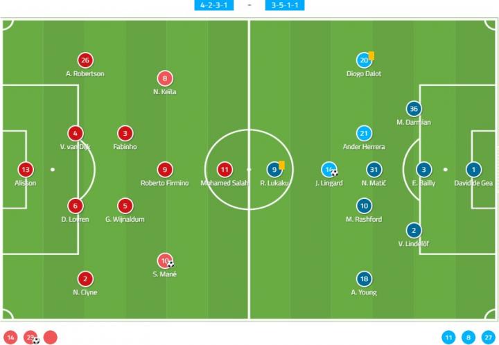 曼联方面,最近经常顶在最前面的拉什福德回撤到第二道进攻线上,卢卡库首发单前锋顶在最前面。穆里尼奥的想法是在中路建立一个密不透风的防御区块,以阻止来自利物浦中路的攻击,但是,他们显然没有做到这点,因为整场比赛利物浦有36次射门,是他们本赛单场射门最多的一场比赛。