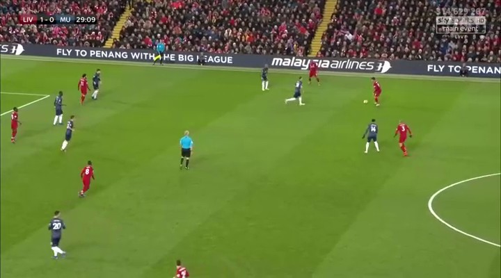 正如我们前面所提到的一样,曼联从一开始就没能有效的限制利物浦对中路核心区域的利用,终于在第24分钟,利物浦找到了方法,法比尼奥挑传给前插到禁区内的马内,马内胸停后直接扫射破门,没有任何干扰。毫无疑问这是一个完美的射门,但是曼联在防区内挤了5名防守球员,并没有起到作用。正如我们提到的,曼联防守始终有防守的人数优势,虽然人很多,但他们防守的效果太差了,在给马内助攻前,法比尼奥有充足的接球空间,他用最舒服的方式控制球,然后几乎是瞄准了给马内一次精彩的助攻。