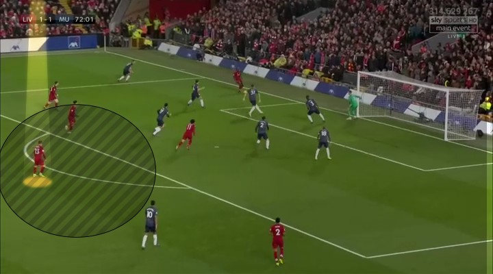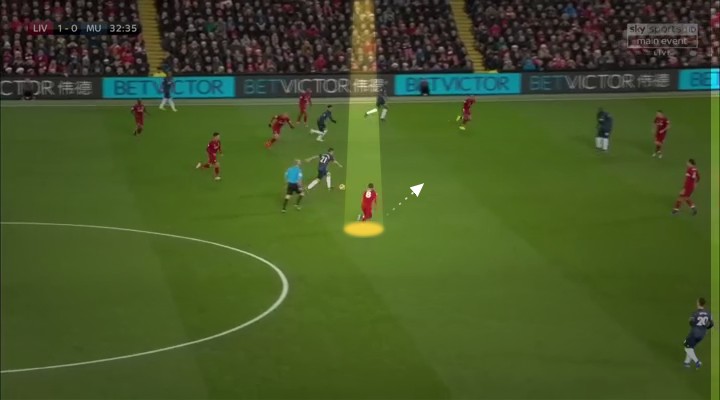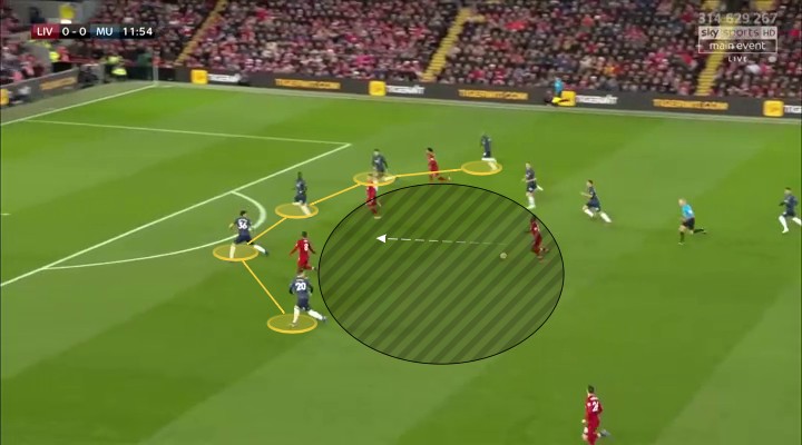 虽然曼联的主要策略就是封锁中路,但是利物浦似乎也从未停止过试图利用这一区域做文章,由于比赛高速的攻防转换,让他们可以通过一些快速的传倒配合和运球,努力在这个区域打开局面。
