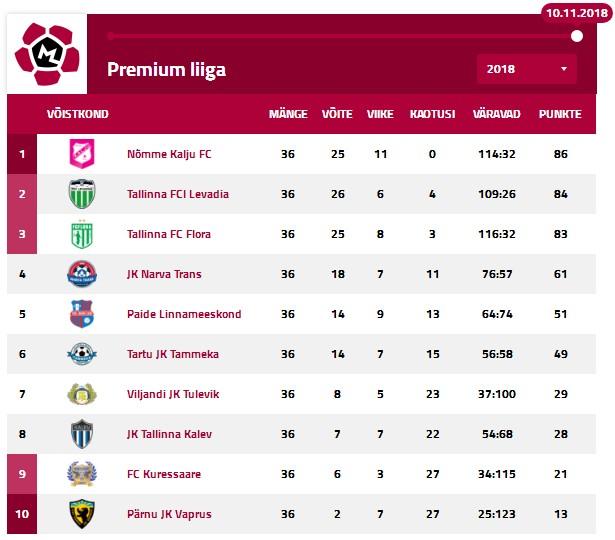 来到本赛季,争冠的仍然是big3,而且争夺比上赛季更激烈,冠军悬念一直延续到最后一轮。开局阶段,big3轮流登上榜首。中后段诺梅卡柳站稳榜首,但是塔林弗罗拉与利瓦迪亚通讯网仍然追得很紧。最后一轮前,诺梅卡柳与塔林弗罗拉同积83分,利瓦迪亚通讯网积81分紧随两队之后,不过塔林弗罗拉与利瓦迪亚通讯网在末轮直接交锋。最终诺梅卡柳4-1大胜排名第四的纳尔瓦(JK Narva Trans),塔林弗罗拉1-2不敌利瓦迪亚通讯网,诺梅卡柳以不败战绩夺得冠军。