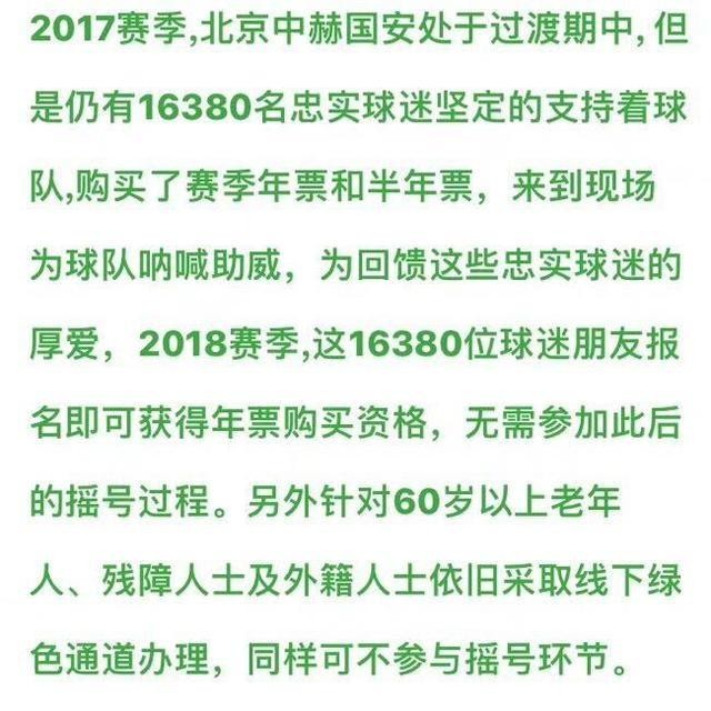 由于2017年国安的战绩不甚理想,套票购买人数减少,所以2018赛季的套票规定调整为:上赛季购买了年票和半年票的球迷,在新赛季只需要报名即可获得年票购买资格,其他人通过摇号争夺剩余的套票。