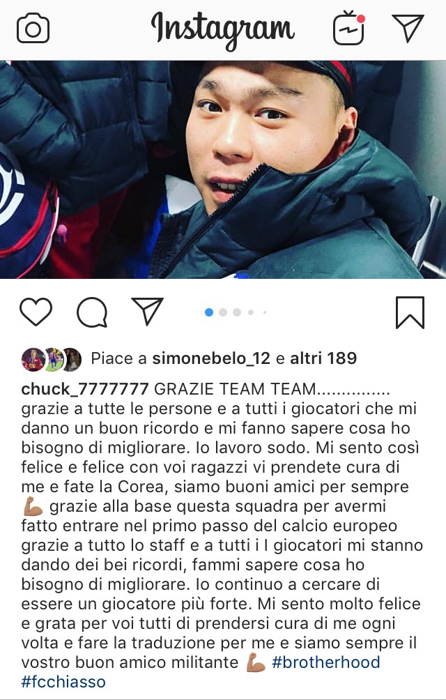这位香港球员在社交网站Instagram表示:“感谢基亚索这个团队让我踏入欧洲足球的第一步,感谢所有职员和所有球员给了我很美好的回忆,让我知道我需要改进什么,我会继续努力成为一个更强大的球员。”