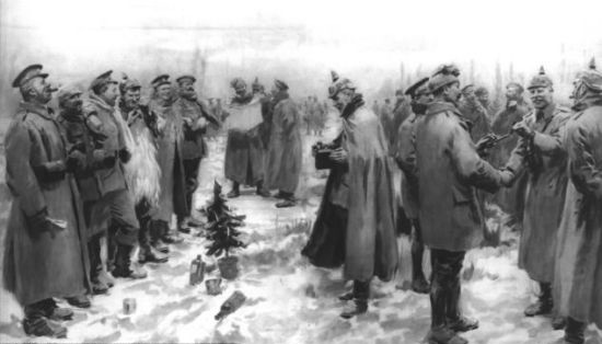 在德军士兵一曲欢快的圣诞颂歌之后,英国人走出战壕、穿越了“无人区”,在靠近敌人战线的一方点亮了一棵圣诞树。此后,互动更加大胆,两军阵地交替唱起了圣歌和颂歌,曲罢对应一方总会给予掌声和欢呼,德国人甚至吹响了军号助兴,双方就这样踏着歌声来到“无人区”毫不设防地集会起来。